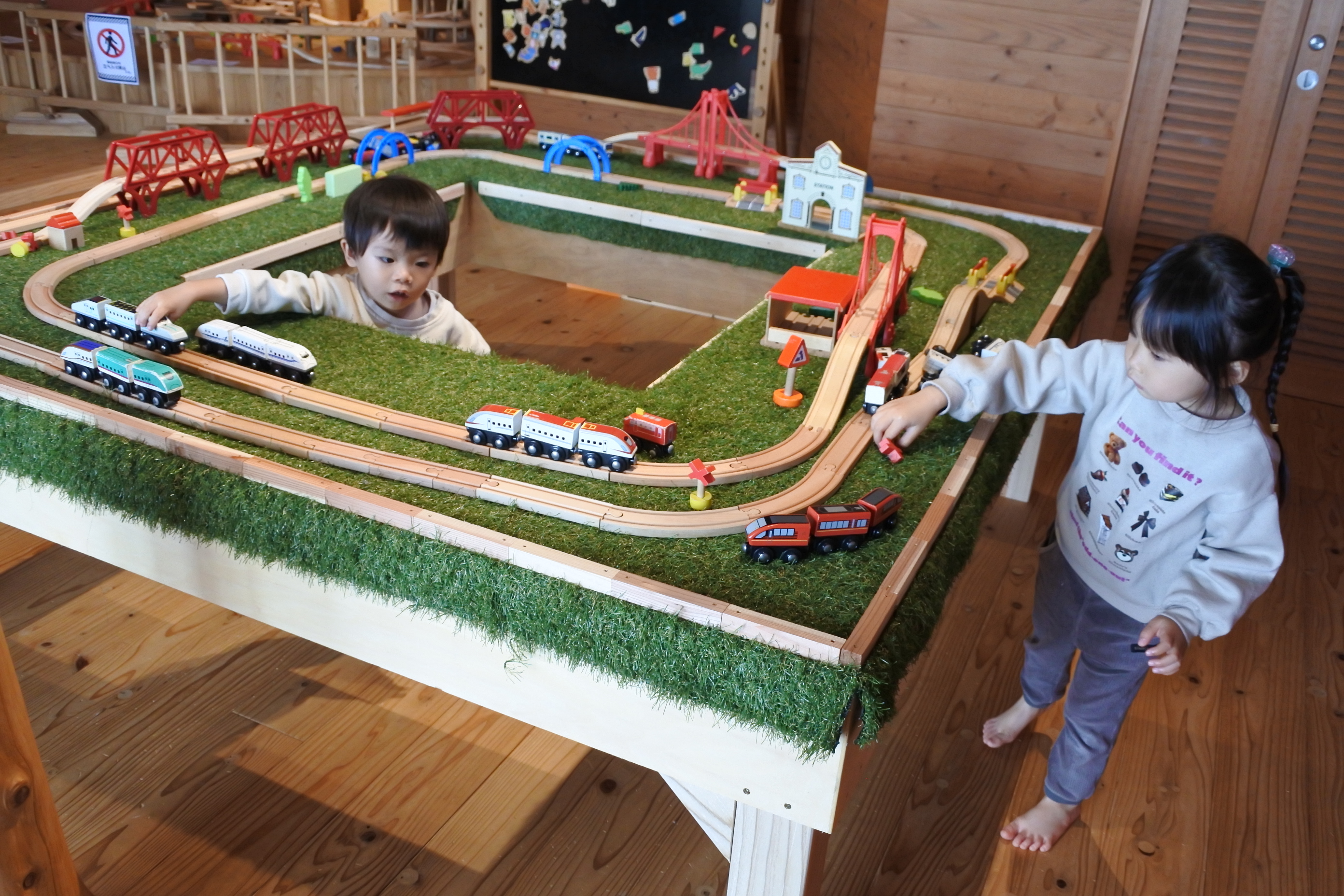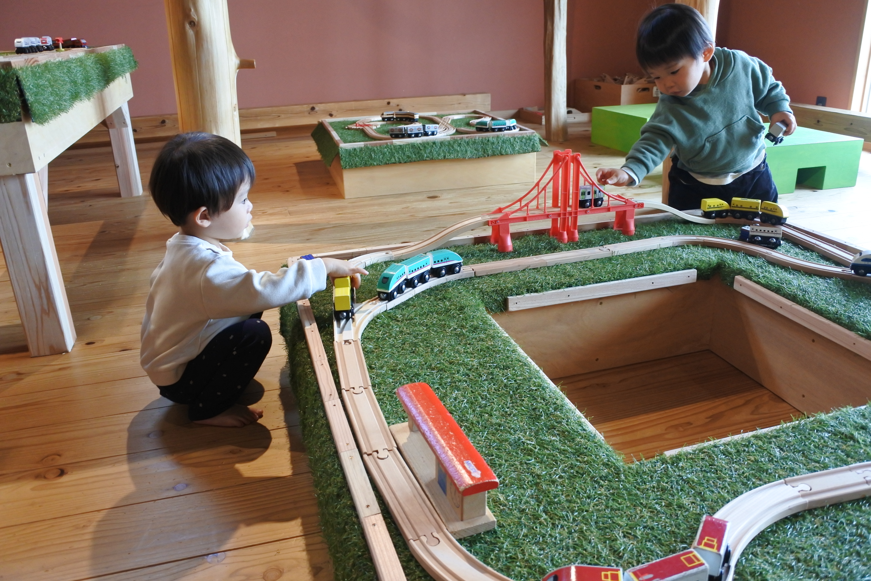 あそびハウスこどもと森では、たくさんの木製レールと木の電車で遊べるお部屋があります。